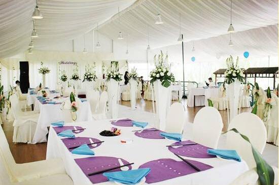3、篷房效果:戶外婚禮注重個(gè)性、浪漫以及獨(dú)特性,篷房四周和內(nèi)部可以使用各種配套設(shè)施,噴繪、頂幔、圍幔、燈光、LED大屏、音響、舞臺(tái)、T臺(tái)等,取得完全區(qū)別于酒店的新穎效果。