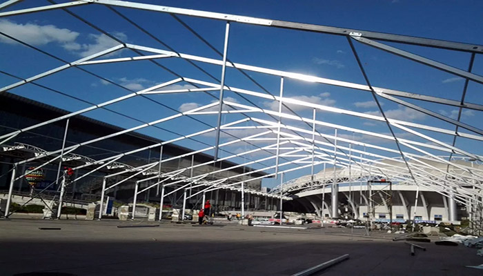這些問題,對于高山環保篷房來說“都不是事”——首先高山環保系列篷房的跨度可以根據需要做到50米以上,邊高在15米以上,頂高20米以上,可以開口安裝巨型大門,吊車、重卡等大型裝備輕松進出。更寶貴的是內部無梁無柱,盡可輾轉騰挪,大大提高工作效率。