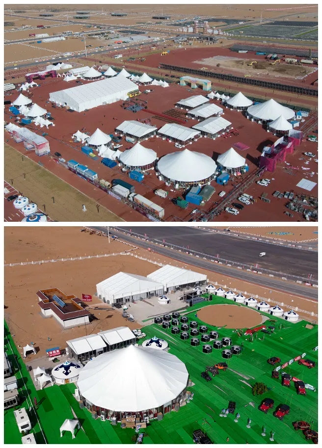 高山篷房在沙漠上一個月時間建筑一座城,各種人字,多邊形,球形,四角亭等篷房共計2萬多平方,燈光,地板,玻璃門,墻體等配套是最全與要求最高一次,從生產(chǎn),配套,安裝等方面出色完成了任務(wù),得到阿拉善盟與組委會贊賞,從2015年開始連續(xù)合作6年,看重高山公司整體實力與彼此相信力量,英雄大會有幸,因高山篷房而增色不少。