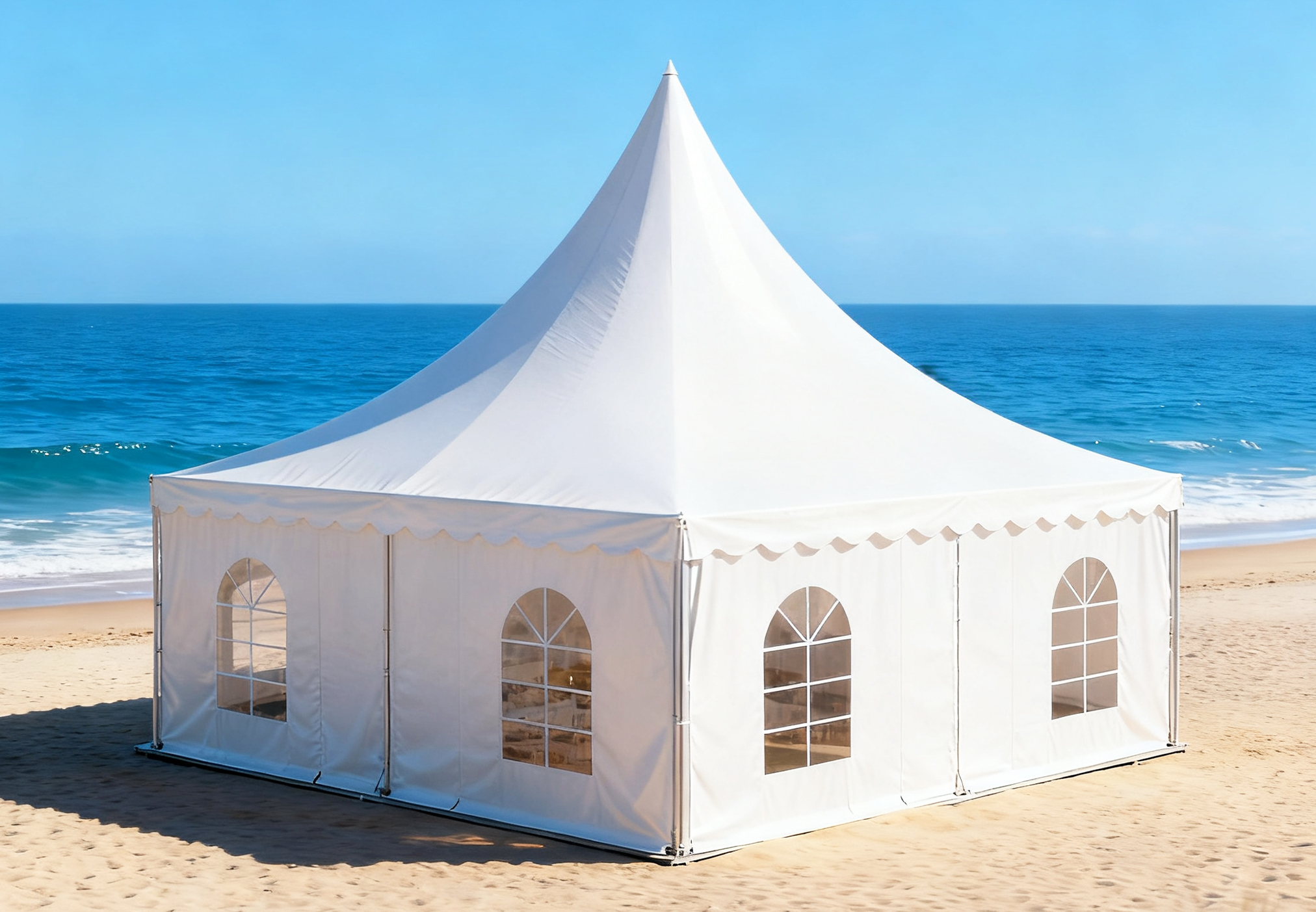篷房主體框架采用高強度鋁合金材料,重量輕、耐腐蝕、不生銹,確保了在戶外環(huán)境中的穩(wěn)定性。篷布則采用高質量的PVC刀刮膜涂層布,具備優(yōu)異的防風、防雨、防曬和阻燃性能,抗風能力可達8-10級,尖頂造型還有利于雨雪快速滑落,提升復雜氣候下的使用安全性。
