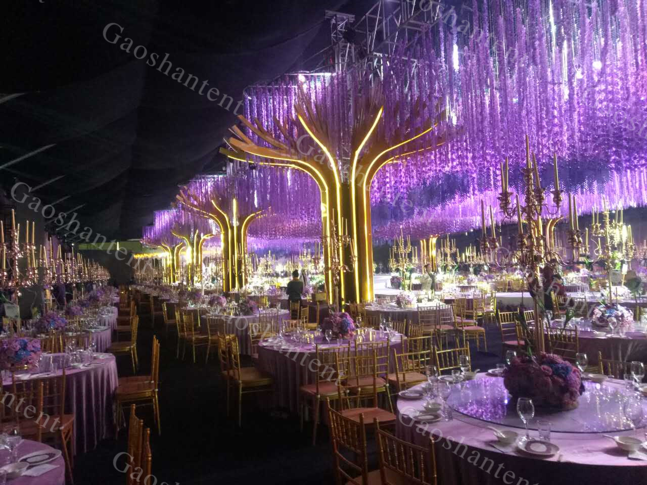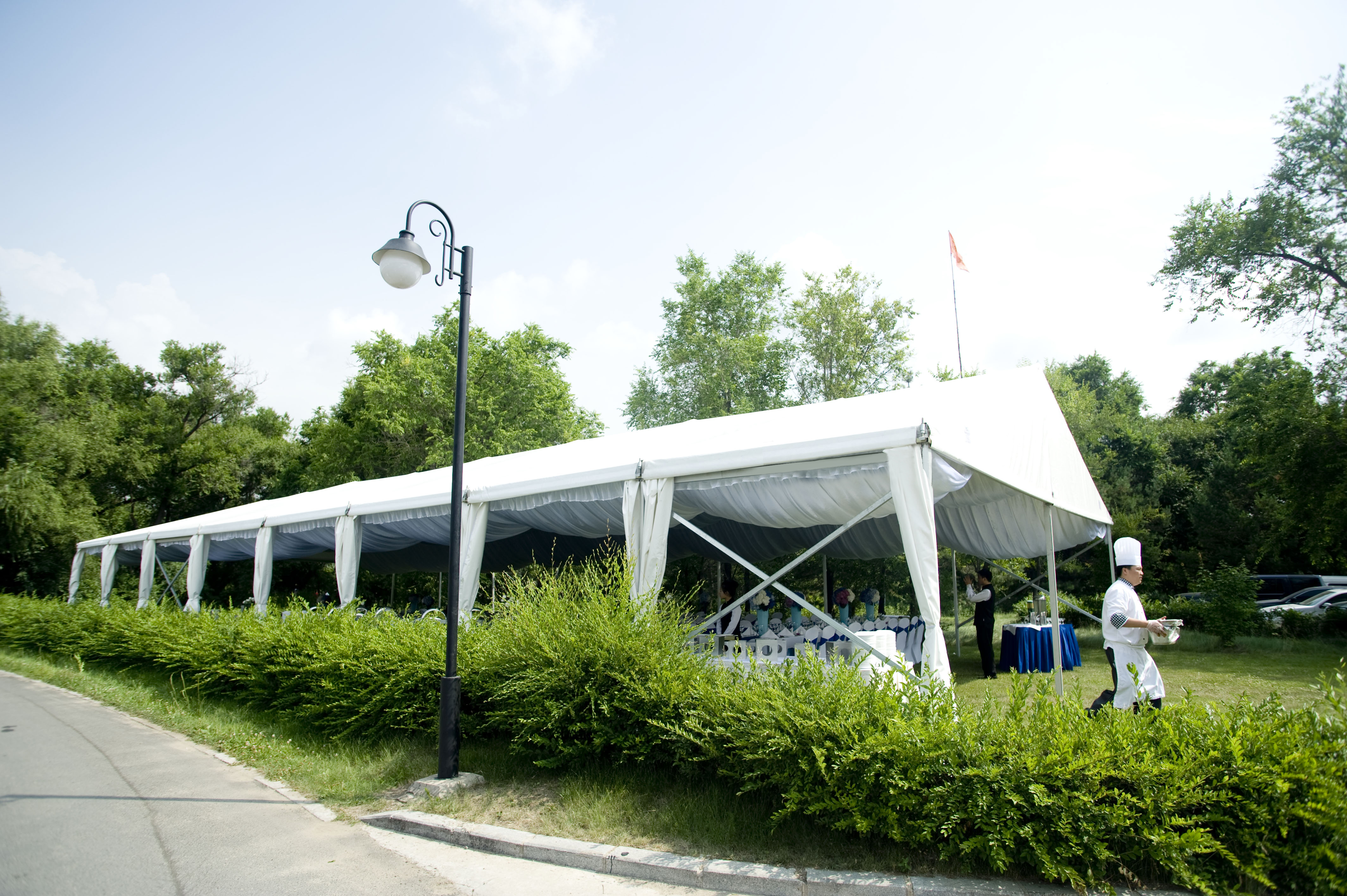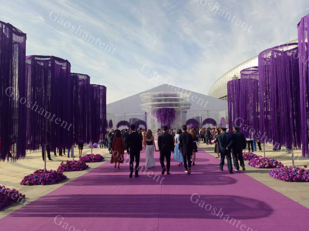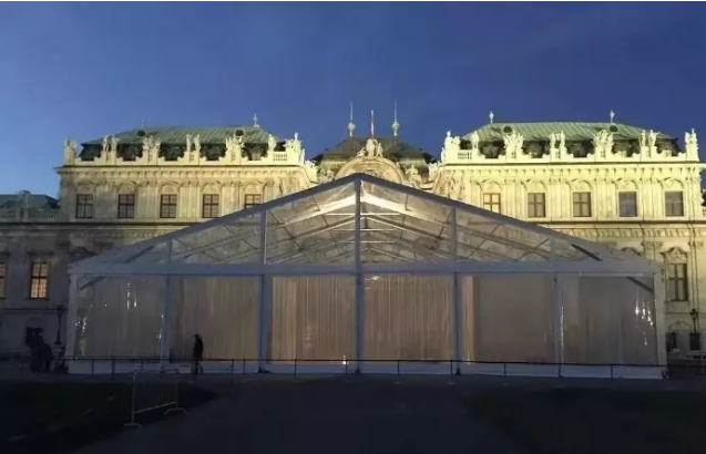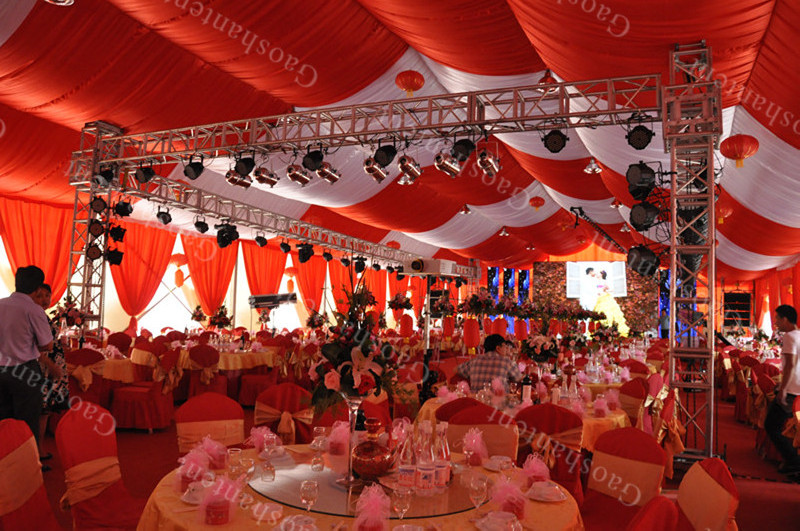 高山篷房還可量身定制進行篷房的布置和提供配套服務。篷房內的空調、地板、燈光等為基本配置,高山還能用布幔、擺設等將其布置成五星級酒店大廳,并提供舞美、表演、樂隊等配套服務。