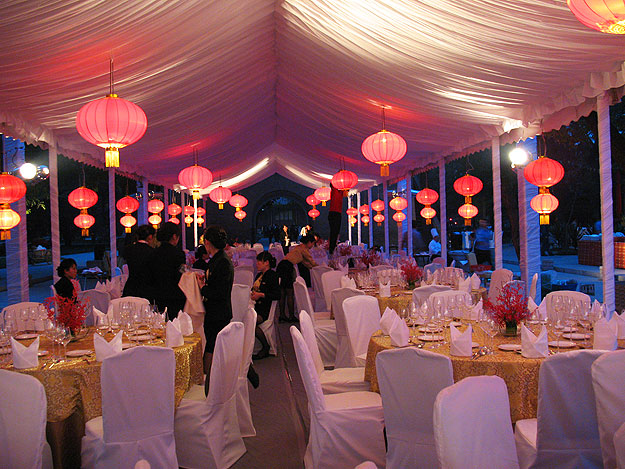 根據客戶的需求制定合適的篷房方案,一般情況下婚禮活動上用的較多的篷布有紅色篷布和透明篷布,主要根據客戶的喜好來搭配,紅色篷房搭建出來的效果比較喜慶熱鬧,風格偏向于中式婚禮多一點;而透明篷布搭建出來的效果則簡約大氣,風格偏向于西式婚禮,在篷布選擇上根據客戶的需求做出不同方案。